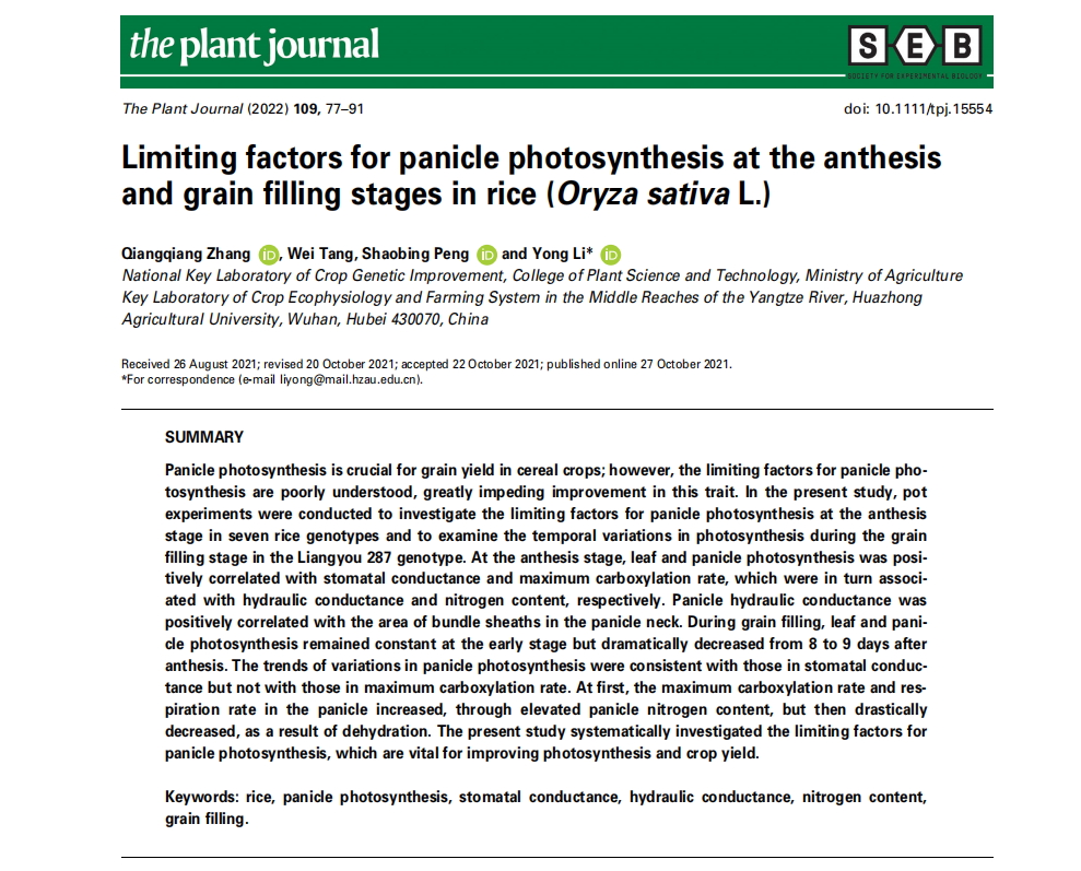 Zhang QQ, Tang W, Peng SB, Li Y*. 2022. Limiting factors for panicle photosynthesis at the anthesis and grain filling stages in rice (Oryza sativa L.). The Plant Journal 109: 77-91.