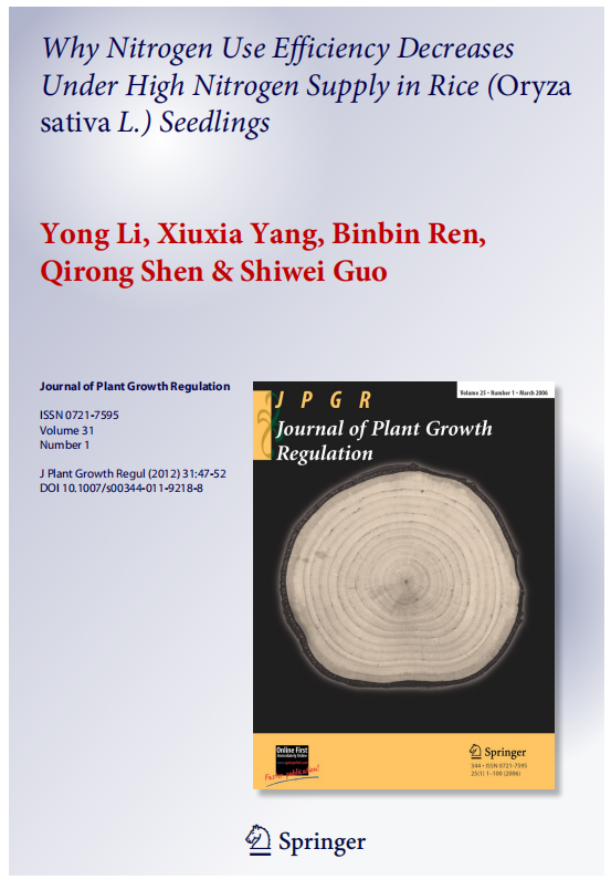 Li Y, Yang XX, Ren BB, Shen QR, Guo SW*. 2012. Why nitrogen use efficiency decreased under high nitrogen supply of rice seedlings (Oryza sativa L.)? Journal of Plant Growth Regulation 31(1): 47-52.
