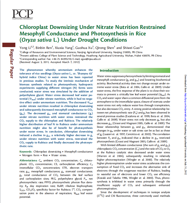 Li Y, Ren BB, Yang XX, Xu GH, Shen QR, Guo SW*. 2012. Chloroplasts downsizing under nitrate nutrition restrained mesophyll conductance andphotosynthesis in rice (Oryza sativa L.) under drought conditions. Plant and Cell Physiology 53(5): 892-900.