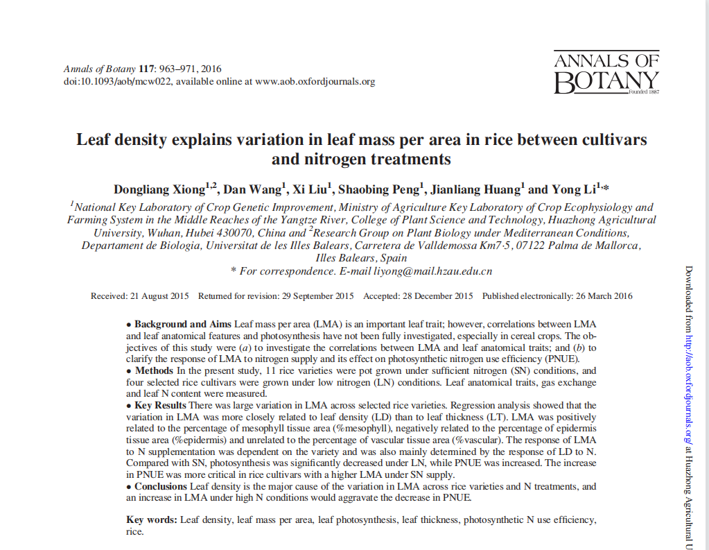 Xiong DL, Wang D, Liu X, Peng SB, Huang JL, Li Y*. 2016. Leaf density explains variation in leaf mass per area in rice across cultivars and nitrogen treatments. Annals of Botany, 117: 963–971.