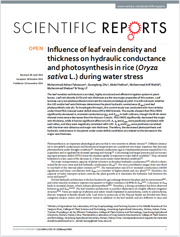 Tabassum MA, Zhu GL, Hafeez A, Wahid MA, Shaban M, Li Y*. 2016. Influence of leaf vein density and thickness on hydraulic conductance and photosynthesis in rice (Oryza sativa L.) during water stress. Scientific Reports 6:36894; DOI: 10.1038/srep36894.