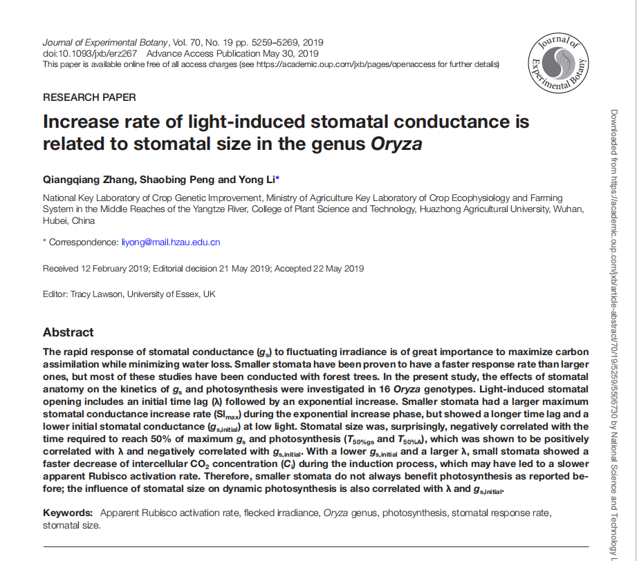 Zhang QQ, Peng SB, Li Y*. 2019. Increase rate of light-induced stomatal conductance is related to stomatal size in the genus Oryza. Journal of Experimental Botany, 70: 5259–5269.