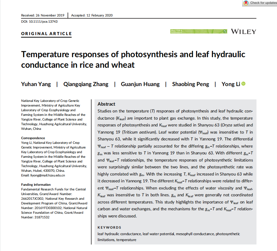 Yang YH, Zhang QQ, Huang GJ, Peng SB, Li Y*. 2020. Temperature responses of photosynthesis and leaf hydraulic conductance in rice and wheat. Plant, Cell and Environment, 43: 1437-1451.