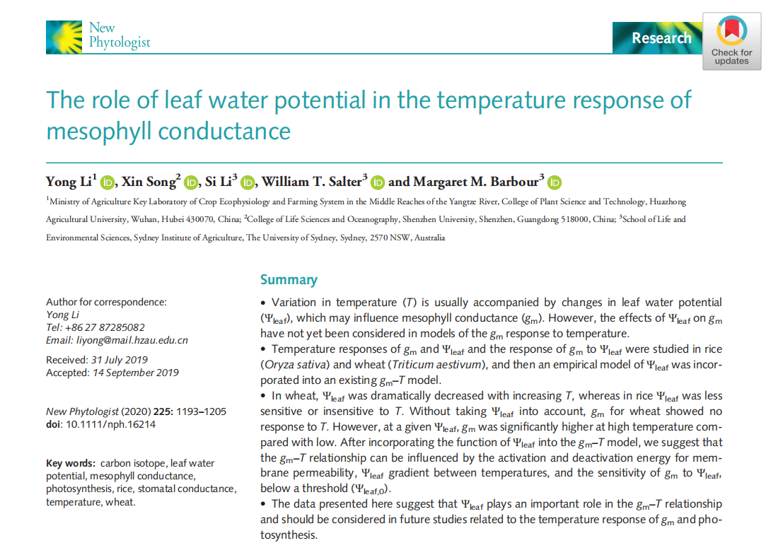 Li Y*, Song X, Li S, Salter WT, Barbour MM. 2020. The role of leaf water potential in the temperature response of mesophyll conductance. New Phytologist, 225: 1193–1205.