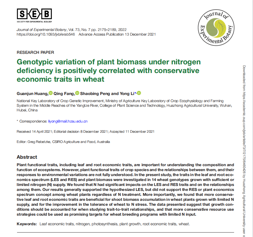 Huang GJ, Fang Q, Peng SB, Li Y*. 2022. Genotypic variation of plant biomass under nitrogen deficiency is positively correlated with conservative economic traits in wheat. Journal of Experimental Botany 73: 2175-2189