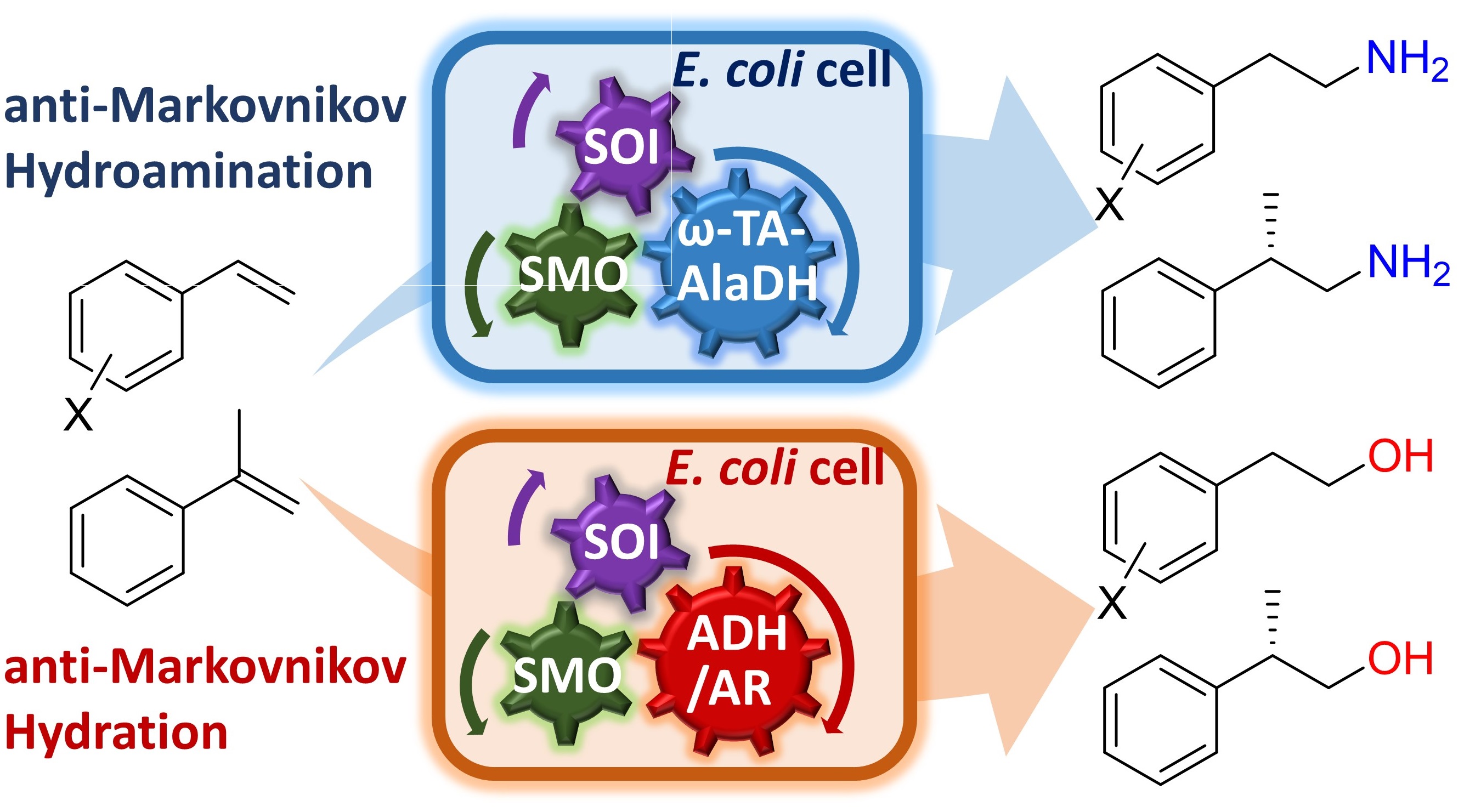 摘要:开发全细胞多酶催化实现形式上的反马氏选择性水合化(合成端位醇)和氢胺化(合成端位胺)。
