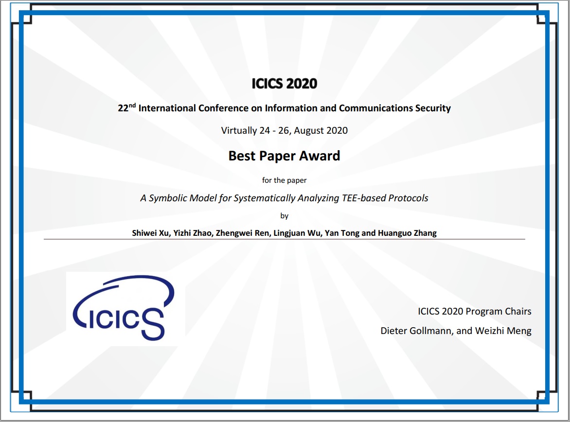 ICICS 2020(CCF C类)国际会议最佳论文奖(Best Paper Award,第一作者)